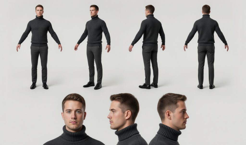 Créez une fiche de référence de personnage professionnelle basée strictement sur l’image de référence téléchargée. Utilisez un arrière-plan uni neutre et propre, et présentez la fiche sous forme de rotation technique de modèle tout en respectant exactement le style visuel de la référence (même niveau de réalisme, approche de rendu, texture, traitement des couleurs et esthétique globale). Arrangez la composition en deux rangées horizontales. Rangée supérieure : quatre vues en pied debout placées côte à côte dans cet ordre : vue de face, vue de profil gauche (face à gauche), vue de profil droite (face à droite), vue de dos. Rangée inférieure : trois portraits en gros plan hautement détaillés alignés sous la rangée en pied dans cet ordre : portrait de face, portrait de profil gauche (face à gauche), portrait de profil droite (face à droite). Maintenez une cohérence parfaite d’identité dans chaque panneau. Gardez le sujet dans une pose A détendue avec une échelle et un alignement constants entre les vues, une anatomie précise et une silhouette claire ; assurez un espacement régulier et une séparation nette des panneaux, avec un cadrage uniforme et une hauteur de tête constante dans la rangée en pied, ainsi qu’une échelle faciale constante dans les portraits. L’éclairage doit être cohérent dans tous les panneaux (même direction, intensité et douceur), avec des ombres naturelles et contrôlées qui préservent les détails sans changements d’humeur dramatiques. Produisez une fiche de référence au rendu net et prêt à imprimer, avec des détails nets.
