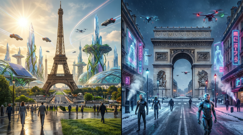 À gauche : Paris en l’an 3000, vu depuis les abords de la Tour Eiffel par un après-midi d’été lumineux, dans un style photographique réaliste. Architecture futuriste avancée, ciel lumineux, véhicules volants, passants vêtus de tenues modernes et épurées, reflets chauds du soleil, textures hyper-détaillées, atmosphère photo-réaliste, profondeur de champ cinématographique.